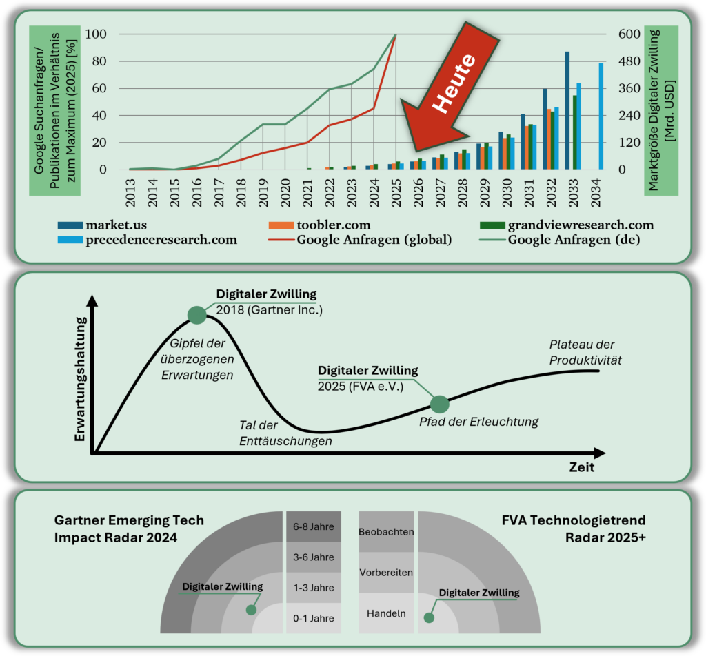 Unsere Umfragen zeichnen schon ein stimmiges Bild ab. Um dieses allerdings zu erweitern und noch robuster zu machen, haben wir knapp 30 weitere Umfragen zum Thema Digitaler Zwillinge herangezogen und Kernergebnisse verglichen. Insgesamt konnte eine übergreifende und einheitliche Landschaft an wahrgenommenen Potentialen und Herausforderungen erarbeitet werden.